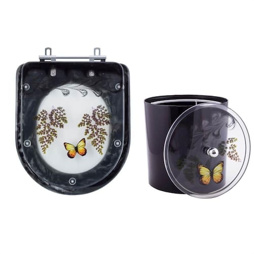 Kit Assento Sanitário Carrara e Lixeira Decoradas Preto com Borboleta Amarela e Avencas é a escolha perfeita para completar seu banheiro. Com acabamento diferenciado, este conjunto combina perfeitamente com o banheiro.