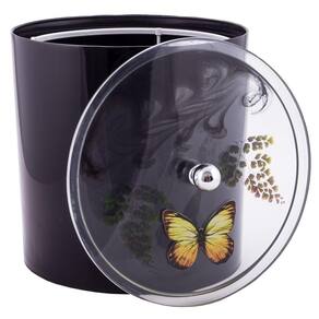 O corpo do cesto é produzido em plástico polipropileno na cor Preto, é muito resistente e fácil de limpar. A tampa é fabricada em Resina Poliéster transparente decorado com Borboleta Amarela e Avencas, possui acabamento impecável e irá trazer ainda mais elogios para seu banheiro. A decoração é uma transparência que fica dentro da resina, não sai e não desbota com a limpeza diária.