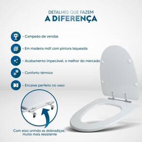 Durabilidade e Resistência: Fabricado em MDF com camadas de pintura laqueada, este assento oferece não apenas beleza, mas também conforto térmico e alta resistência. Seu acabamento impecável adiciona um toque de classe ao seu banheiro.