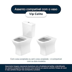 Detalhes e Cuidados Especiais: * Cor: Branco * Compatibilidade: Modelo Vipda marca Celite* Conteúdo da Embalagem: Assento sanitário, parafusos de fixação e instruções de instalação. * Fabricante do Assento Sanitário: Pontto Lavabo (enviado na caixa conforme foto no anúncio).