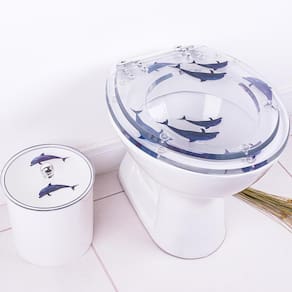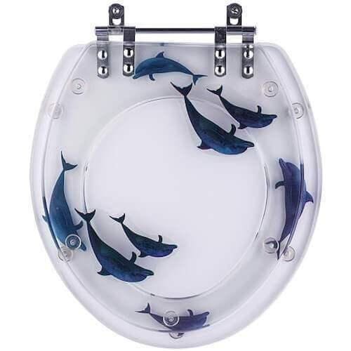 Assento sanitário fabricado em resina poliéster transparente com decoração de golfinhos inédita e exclusiva e com acabamento de superfície polido de alto brilho. ferragem ultrarresistente e que não oxida com elevadíssimo padrão de acabamento. Possui 10 calços de pvc distribuídos na tampa e no assento, que possibilitam total estabilidade sobre a louça. maciço em resina de poliéster é totalmente impermeável. Com excepcional durabilidade tem design específico e diferenciado. Este anuncio inclui somente o assento sanitário, todos os elementos decorativos das fotos não estão inclusos (ex: vaso sanitário, lixeira, etc) informações técnicas: principais componentes: tampa e assento em resina virgem de poliéster, calços de pvc para assentamento na louça, ferragem em metal inoxidável com sistema de fixação regulável, embalagem dupla reforçada. compatibilidade: izy (deca), fiore/flamingo (incepa), azálea (celite), sabará/diamantina (icasa), fiori (fiori), parati (logasa)/ oval/ universal cor: branco uso: para todas as louças