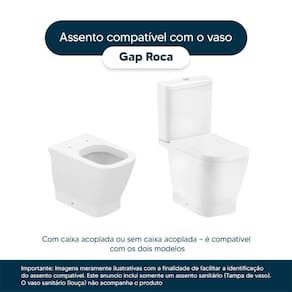 Este assento sanitário é compatível para uso em vaso sanitário Roca modelo Gap com ou sem caixa acoplada.
