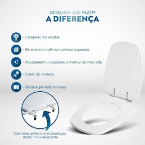 Assento Sanitário em MDF Monte Carlo Branco para bacia Deca traz beleza e praticidade ao seu banheiro. Esta Tampa de Privada é fabricada em MDF com pintura laqueada, acabamento brilhante e ferragem metálica muito resistente que não oxida. É compatível para uso em vasos sanitários com ou sem caixa acoplada. Instalação rápida e fácil, acompanha parafusos de fixação e basta apenas uma chave de fenda para instalar no vaso. Entrega garantida e rastreada com embalagem dupla reforçada. Cor: Branco. Distância entre meio dos furos da louça: 15 cm. Acabamento: brilhante. Dicas: Itens inclusos: produto completo, assento e tampa em madeira MDF pintado e ferragem em alumínio. Limpeza: recomenda-se a limpeza com pano úmido e sabão neutro e não utilizar produtos abrasivos ou químicos. Instalação: Sem desmontar o produto, posicione sobre o vaso sanitário e encaixe os dois parafusos com as borrachas pretas dentro dos furos do vaso. Aperte com a chave de fenda no sentido horário até ficar firme. Importante: este anúncio inclui somente o produto conforme descrição acima. Todos os elementos decorativos das fotos não estão inclusos. Observação: O código 6LPF gravado na louça sanitária corresponde ao fluxo de água em litros de uma descarga e não indica o modelo da mesma.