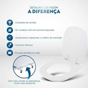 Durabilidade e Resistência: Fabricado em MDF com camadas de pintura laqueada, este assento oferece não apenas beleza, mas também conforto térmico e alta resistência. Seu acabamento impecável adiciona um toque de classe ao seu banheiro.