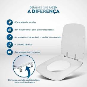 Durabilidade e Resistência: Fabricado em MDF com camadas de pintura laqueada, este assento oferece não apenas beleza, mas também conforto térmico e alta resistência. Seu acabamento impecável adiciona um toque de classe ao seu banheiro.