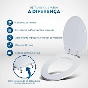 Durabilidade e Resistência: A única marca que utiliza MDF Ultra, muito mais durável e resistente. Contém camadas de pintura laqueada, este assento oferece não apenas beleza, mas também conforto térmico e alta resistência. Seu acabamento impecável adiciona um toque de classe ao seu banheiro.