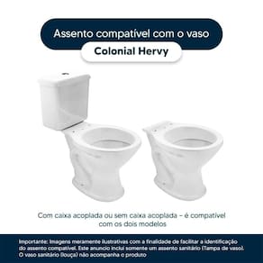 Detalhes e Cuidados Especiais: * Cor: Preto * Compatibilidade: Modelo Colonial da marca Hervy * Conteúdo da Embalagem: Assento sanitário, parafusos de fixação e instruções de instalação. * Fabricante do Assento Sanitário: Pontto Lavabo.