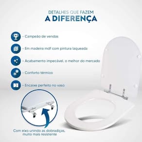 Durabilidade e Resistência: Fabricado em MDF com camadas de pintura laqueada, este assento oferece não apenas beleza, mas também conforto térmico e alta resistência. Seu acabamento impecável adiciona um toque de classe ao seu banheiro.