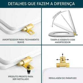 Itens inclusos: assento e tampa em madeira MDF com pintura laqueada. Ferragens na cor Dourada em alumínio anodizado muito resistente, não oxidam e não enferrujam.
