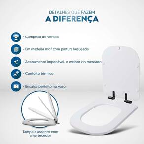 Itens inclusos: assento e tampa em madeira MDF com pintura laqueada. Ferragens na cor Preta em alumínio anodizado muito resistente, não oxidam e não enferrujam.