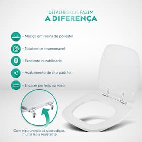 Limpeza: recomenda-se a limpeza do assento sanitário poliéster com água e sabão neutro, não utilizar produtos abrasivos.