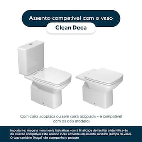 Compatível com o vaso sanitário Deca modelo Clean com ou sem caixa acoplada.