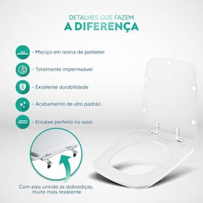 Durabilidade e Resistência: Fabricado em resina maciça de poliéster, este assento sanitário é altamente resistente e totalmente impermeável.