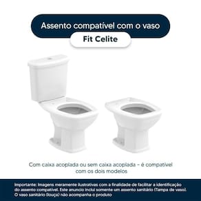 Instalação Simples e Rápida: Com todos os parafusos e componentes necessários inclusos, a instalação é rápida e descomplicada. Seu novo assento estará pronto para uso em questão de minutos. Desenvolvido especificamente para o modelo Fit da marca Celite, com ou sem caixa acoplada, proporciona um encaixe perfeito, oferecendo estabilidade e conforto durante o uso.