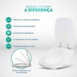 Durabilidade e Resistência: Fabricado em resina maciça de poliéster, este assento sanitário é altamente resistente e totalmente impermeável.