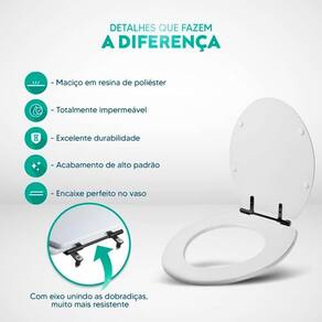 Durabilidade e Resistência: Fabricado em resina maciça de poliéster, este assento sanitário é altamente resistente e totalmente impermeável.
