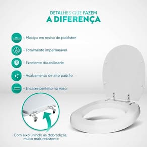 Durabilidade e Resistência: Fabricado em resina maciça de poliéster, este assento sanitário é altamente resistente e totalmente impermeável.