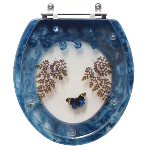Assento Sanitário com decoração de Avenca e Borboleta exclusiva e com acabamento de superfície polido de alto brilho. Totalmente impermeável, muito resistente. A decoração fica dentro da resina, não sai e não desbota com a limpeza diária. Produto muito bonito, irá trazer ainda mais elogios ao seu banheiro. Compatível com vasos com ou sem caixa acoplada do modelo convencional / oval / universal. Ferragem ultrarresistente e que não oxida e não eferruja. Os produtos de poliéster com decoração podem apresentar uma eventual variação em relação as fotos apresentadas, pois tem em seu processo de fabricação uma parte puramente artesanal, o que lhes confere identidade única e absoluta originalidade. Informações Técnicas: Principais Componentes: Tampa e Assento em Resina Virgem de Poliéster, calços de PVC para assentamento na louça, ferragem em metal inoxidável com sistema de fixação regulável, embalagem dupla reforçada Compatibilidade: Izy (Deca), Fiore/Flamingo (Incepa), Azálea (Celite), Sabará/Diamantina (Icasa), Fiori (Fiori), Parati (Logasa) Cor: Azul escuro Uso: Para todas as louças de formato convencional / oval Importante: imagens meramente ilustrativas, todos os elementos decorativos das fotos não estão inclusos (por exemplo: vaso sanitário, etc) Ean: 7897116729061