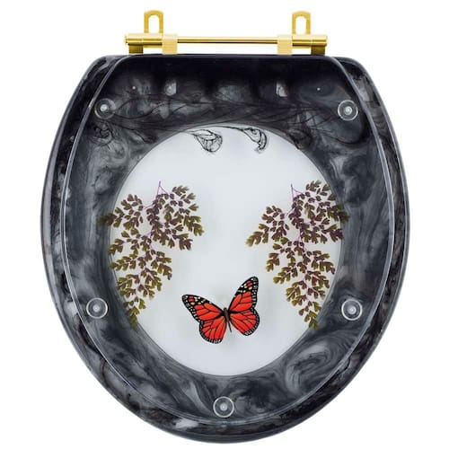 O Assento Sanitário Poliester Decorado Oval Convencional Preto Avenca com Borboleta Vermelha Com Ferragem Dourada é a opção ideal para quem busca combinar funcionalidade com elegância em seu banheiro.