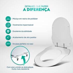 Limpeza: recomenda-se a limpeza do assento sanitário poliéster com água e sabão neutro, não utilizar produtos abrasivos.