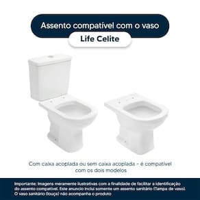 Instalação Simples e Rápida: Com todos os parafusos e componentes necessários inclusos, a instalação é rápida e descomplicada. Seu novo assento estará pronto para uso em questão de minutos. Desenvolvido especificamente para o modelo Life da marca Celite, com ou sem caixa acoplada, proporciona um encaixe perfeito, oferecendo estabilidade e conforto durante o uso.