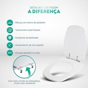 Limpeza: recomenda-se a limpeza do assento sanitário poliéster com água e sabão neutro, não utilizar produtos abrasivos.
