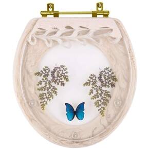 O Assento Sanitário Poliester Oval Bege Claro Decorado Borboleta Azul Com Ferragem Dourada é a opção ideal para quem busca combinar funcionalidade com elegância em seu banheiro.