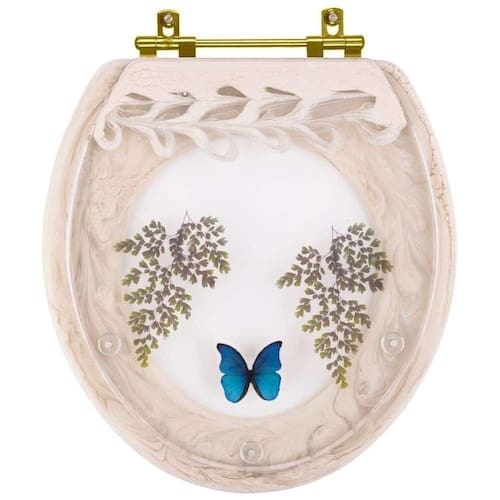 O Assento Sanitário Poliester Oval Biscuit Decorado Borboleta Azul Com Ferragem Dourada é a opção ideal para quem busca combinar funcionalidade com elegância em seu banheiro.