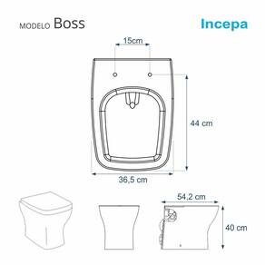 Assento sanitário para Louça Boss (Incepa) fabricado com 100% de resina de poliéster virgem, sem adição de talco industrial, fibra ou manta de madeira. Devido a sua composição maciça em resina de poliéster este produto é totalmente impermeável, resistente a água, fácil higienização e alta durabilidade. Superfície polida com alto brilho e padrão de acabamento Premium. Montado com rebites ocultos e ferragem em aço inoxidável, resistente às condições mais severas encontradas em um ambiente sanitário e com 8 batedores em PVC que proporciona maior durabilidade e conforto.