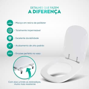 Limpeza: recomenda-se a limpeza do assento sanitário poliéster com água e sabão neutro, não utilizar produtos abrasivos.