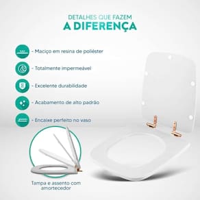 Durabilidade e Resistência: Fabricado em resina maciça de poliéster, este assento sanitário é altamente resistente e totalmente impermeável.