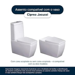 Detalhes e Cuidados Especiais: * Cor: Branco * Compatibilidade: Modelo Ciprea da marca Jacuzzi * Conteúdo da Embalagem: Assento sanitário, parafusos de fixação e instruções de instalação. * Fabricante do Assento Sanitário: Pontto Lavabo.