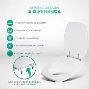 Limpeza: recomenda-se a limpeza do assento sanitário poliéster com água e sabão neutro, não utilizar produtos abrasivos.