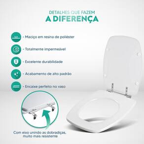Limpeza: recomenda-se a limpeza do assento sanitário poliéster com água e sabão neutro, não utilizar produtos abrasivos.