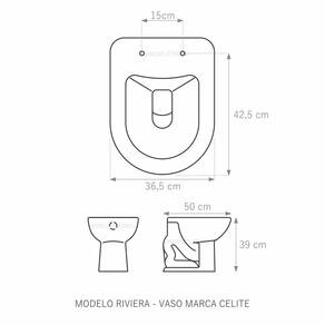 Assento Sanitário tampa de vaso fabricado em madeira MDF com pintura laqueada, com proteção raios UV, que garante excelente acabamento e durabilidade. Compatível com vasos bacias/louças sanitários com ou sem caixa acoplada. Tem calços de PVC instalados na tampa e no assento para proporcionar estabilidade ao uso, pois distribui o peso uniformemente sobre a louça sanitária. Montagem simples e fácil. Possui ferragem em alumínio anodizado que não enferruja/oxida e oferece muita resistência. O assento é acompanhado por parafusos para instalação. Embalagem dupla reforçada garante o recebimento do produto totalmente protegido. Especificações: - Dimensões da caixa: largura: 49,50cm. Altura: 4,00cm comprimento: 39,50cm - Peso do produto: 1,98kg - Acabamento: brilhante - Uso: este assento é adequado para uso na louça Celite modelo Riviera - Garantia: 3 meses - Itens inclusos: Tampa e assento em MDF com calços de PVC, ferragem inoxidável, embalagem duplamente reforçada. Contém todos os parafusos e encaixes para instalação, sendo necessária somente uma chave de fenda para instalar o produto na louça sanitária. Instalação: posicione o produto, devidamente centralizado, em cima do vaso sanitário. Sem desmontar a ferragem, insira as buchas de borracha dentro dos furos da bacia sanitária. Encaixe os parafusos e posicione as porcas. Utilizando uma chave de fenda, aperte o parafuso no sentido horário até que o assento esteja firme e fixo no vaso. Manutenção: recomendamos a limpeza periódica com pano levemente umedecido com sabão neutro. Não usar esponjas abrasivas ou palha de aço nem qualquer tipo de produto químico.