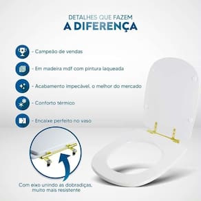 Durabilidade e Resistência: Fabricado em MDF com camadas de pintura laqueada, este assento oferece não apenas beleza, mas também conforto térmico e alta resistência. Seu acabamento impecável adiciona um toque de classe ao seu banheiro.