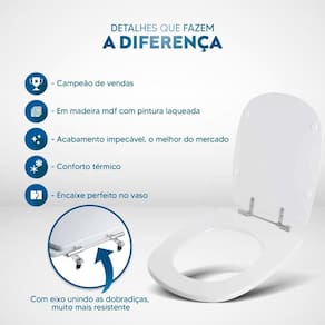 Itens inclusos: assento e tampa em madeira MDF com pintura laqueada. Ferragens metálicas em alumínio anodizado muito resistente, não oxidam e não enferrujam.