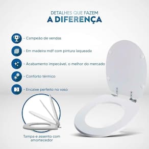 Durabilidade e Resistência: Fabricado em MDF com camadas de pintura laqueada, este assento oferece não apenas beleza, mas também conforto térmico e alta resistência. Seu acabamento impecável adiciona um toque de classe ao seu banheiro.