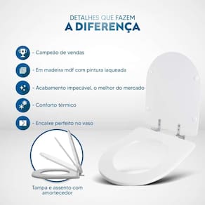 Durabilidade e Resistência: Fabricado em MDF com camadas de pintura laqueada, este assento oferece não apenas beleza, mas também conforto térmico e alta resistência. Seu acabamento impecável adiciona um toque de classe ao seu banheiro.