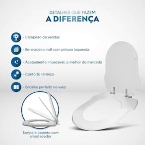 Durabilidade e Resistência: Fabricado em MDF com camadas de pintura laqueada, este assento oferece não apenas beleza, mas também conforto térmico e alta resistência. Seu acabamento impecável adiciona um toque de classe ao seu banheiro.