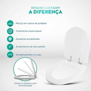 Durabilidade e Resistência: Fabricado em resina maciça de poliéster, este assento sanitário é altamente resistente e totalmente impermeável.