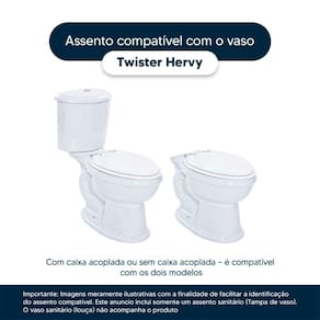 Detalhes e Cuidados Especiais: * Cor: Cinza Claro * Compatibilidade: Modelo Twister da marca Hervy * Conteúdo da Embalagem: Assento sanitário, parafusos de fixação e instruções de instalação. * Fabricante do Assento Sanitário: Pontto Lavabo.