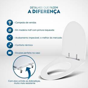 Durabilidade e Resistência: Fabricado em MDF com camadas de pintura laqueada, este assento oferece não apenas beleza, mas também conforto térmico e alta resistência. Seu acabamento impecável adiciona um toque de classe ao seu banheiro.