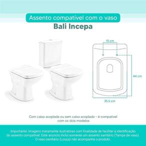 OBS.: O código 6LPF gravado na louça sanitária corresponde ao fluxo de água de uma descarga e não indica o modelo da mesma. RBN: Casa/Banho/Instalações e Acessórios de Banheiro/Vasos Sanitários e Peças/Assento de Vaso Sanitário | Conteúdo da Embalagem: 01 Assento Sanitário | Tipo: Assento Sanitário | Produto: Assento Sanitário | Site do Fabricante: www.ponttolavabo.com.br/ | Marca do Assento Sanitário: Pontto Lavabo | Garantia: 6 meses contra defeitos de fabricação | Dica: Instalação: sem desmontar o produto, posicione sobre o vaso sanitário e encaixe os dois parafusos com as borrachas pretas dentro do furo do vaso. Aperte com a chave de fenda no sentido horário até ficar firme. | Para Vaso Sanitário do Modelo: Bali | Para vaso Sanitário da Marca: Incepa | Cor: Branco | Tonalidade: Branco | Material do Assento Sanitário: MDF Laqueado | Instruções de Limpeza: Recomenda-se a limpeza com pano úmido e sabão neutro, não utilizar produtos abrasivos ou químicos | Almofadado?: Não | Peso do Produto: 1.98 | Tipo de Fechamento: Fechamento Comum | Material da Fixação: Alumínio Anodizado | Precisa de baterias ou pilhas: Não | Regulamentações aplicáveis a produtos perigosos: Não se aplica | Código de certificação: Não se aplica Ean: 7899983692769