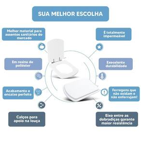 DIFERENCIAL * Possui calços que evitam o contato direto com a louça e que o assento deslize lateralmente. * Proporcionam maior estabilidade durante o uso. * Acabamento e encaixe perfeito no vaso sanitário. * Possui eixo entre as dobradiças, mantendo o assento sanitário firme na louça. * Sua ferragem metálica é super resistente e não oxida e nem enferruja.