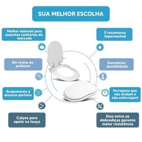DIFERENCIAL * Possui calços que evitam o contato direto com a louça e que o assento deslize lateralmente. * Proporcionam maior estabilidade durante o uso. * Acabamento e encaixe perfeito no vaso sanitário. * Possui eixo entre as dobradiças, mantendo o assento sanitário firme na louça. * Sua ferragem metálica é super resistente e não oxida e nem enferruja.