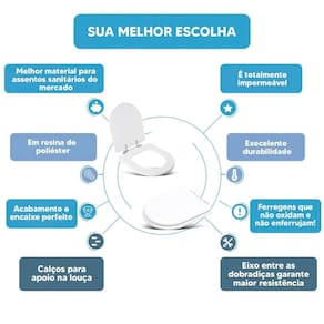 MATERIAL * Fabricado em Resina de Poliéster na cor Branca * É considerado o melhor material para assentos sanitários do mercado