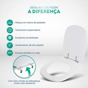 Limpeza: recomenda-se a limpeza do assento sanitário poliéster com água e sabão neutro, não utilizar produtos abrasivos.