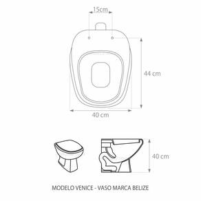 Assento Sanitário Almofadado (tampa de vaso) fabricado em polipropileno e polietileno especial. Resistente, durável, com excelente acabamento e design sofisticado. Assento macio, arco almofadado.Devido a sua composição este produto é totalmente impermeável e de fácil limpeza e higienização. Compatível com vasos sanitários de descarga convencional e também vasos com caixa acoplada. Acabamento brilhante no tampo e no assento. Fixação regulável para o perfeito encaixe na louça sanitária. Fácil limpeza, é higiênico e não acumula sujeira. O assento é acompanhado por parafusos para instalação e acabamentos. Embalagem dupla reforçada garante o recebimento do produto totalmente protegido. Especificações: - Dimensões da caixa: largura: 50,00cm. Altura: 4,00cm comprimento: 40,00cm - Acabamento: brilhante - Uso: este assento é adequado para uso na louça Belize modelo Venice - Garantia: 3 meses - Itens inclusos: Tampa e assento, parafusos e embalagem duplamente reforçada. Instalação: posicione o produto, devidamente centralizado, em cima do vaso sanitário. Encaixe os parafusos e encaixe as porcas. Aperte até que o assento esteja firme no vaso. Manutenção: recomendamos a limpeza periódica com pano levemente umedecido com sabão neutro. Não usar esponjas abrasivas ou palha de aço nem qualquer tipo de produto químico.