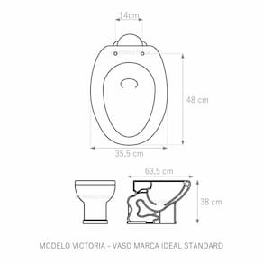 Assento Sanitário (tampa de vaso) fabricado em madeira MDF com pintura laqueada, com proteção raios UV, que garante excelente acabamento e durabilidade. Compatível com vasos (bacias/louças) sanitários com ou sem caixa acoplada. Tem calços de PVC instalados na tampa e no assento para proporcionar estabilidade ao uso, pois distribui o peso uniformemente sobre a louça sanitária. Montagem simples e fácil. Possui ferragem em alumínio anodizado que não enferruja/oxida e oferece muita resistência. O assento é acompanhado por parafusos para instalação. Embalagem dupla reforçada garante o recebimento do produto totalmente protegido. Especificações: - Dimensões da caixa: largura: 49,50cm. Altura: 4,00cm comprimento: 39,50cm - Peso do produto: 1,98kg - Acabamento: brilhante - Uso: este assento é adequado para uso na louça Ideal Standard modelo Victoria - Garantia: 3 meses - Itens inclusos: Tampa e assento em MDF com calços de PVC, ferragem inoxidável, embalagem duplamente reforçada. Contém todos os parafusos e encaixes para instalação, sendo necessária somente uma chave de fenda para instalar o produto na louça sanitária. Instalação: posicione o produto, devidamente centralizado, em cima do vaso sanitário. Sem desmontar a ferragem, insira as buchas de borracha dentro dos furos da bacia sanitária. Encaixe os parafusos e posicione as porcas. Utilizando uma chave de fenda, aperte o parafuso no sentido horário até que o assento esteja firme e fixo no vaso. Manutenção: recomendamos a limpeza periódica com pano levemente umedecido com sabão neutro. Não usar esponjas abrasivas ou palha de aço nem qualquer tipo de produto químico.
